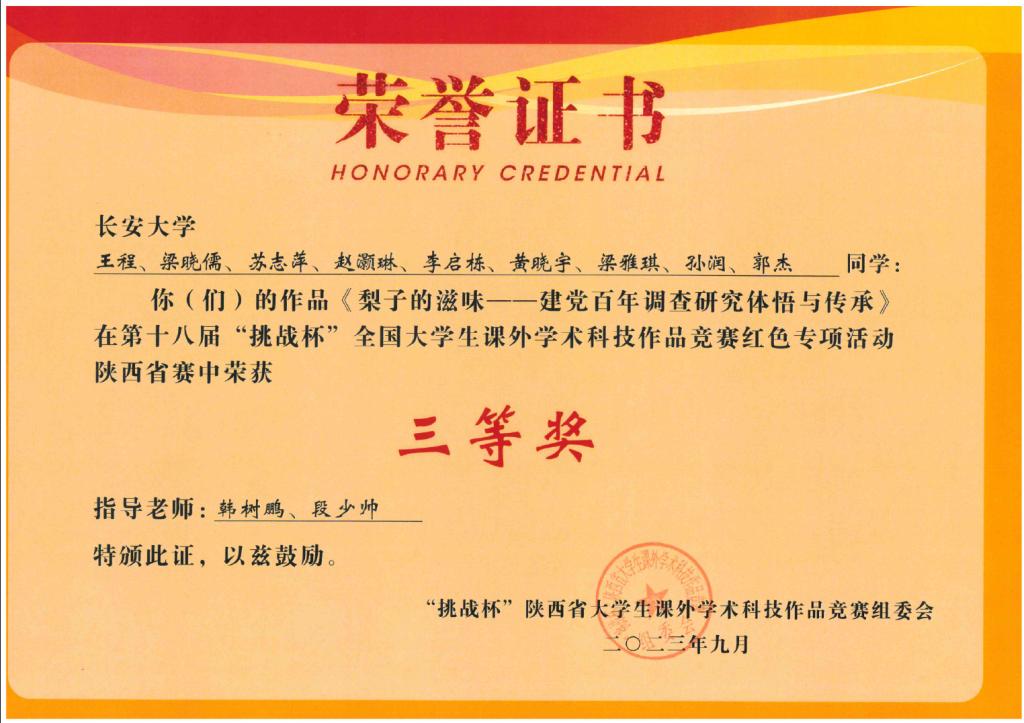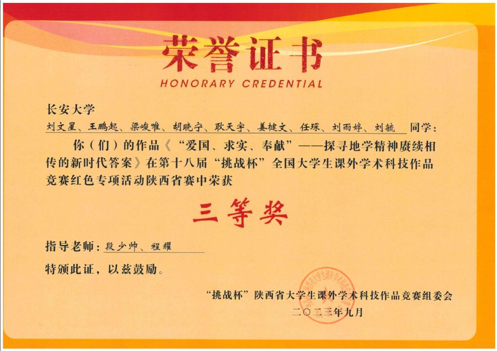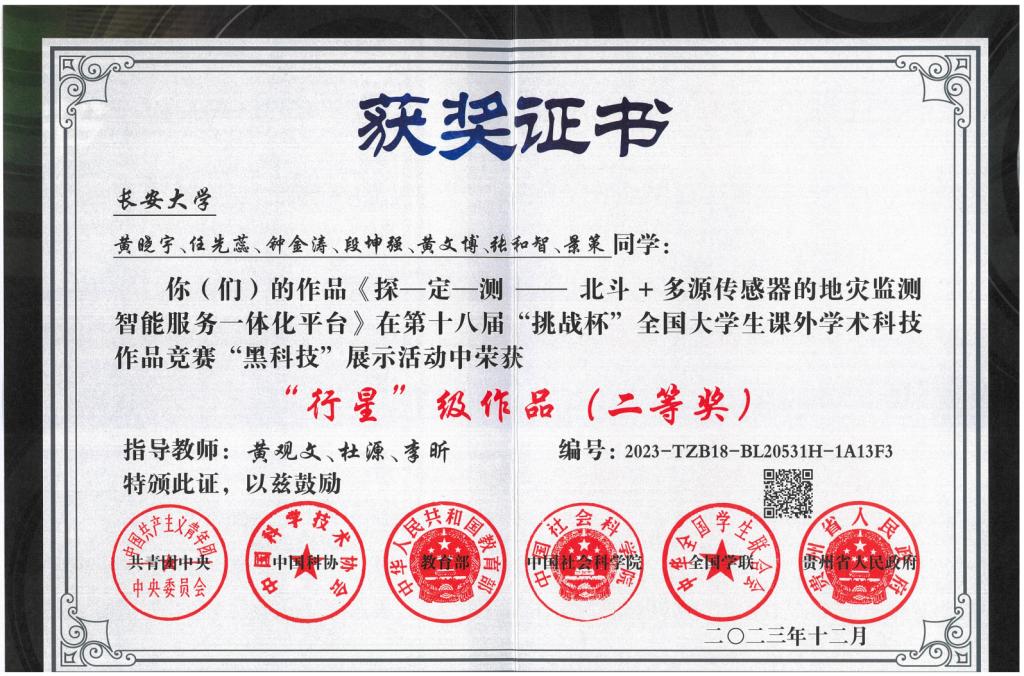 在第十八届“挑战杯”全国大学生课外学术科技作品竞赛“黑科技”专项赛中,地测学院黄晓宇等同学的作品《探-定-测——北斗+多源传感器的地灾检测智能服务一体化平台》获“行系”级作品;红色专项活动中,地测学院参赛作品《“爱国、求实、奉献”——探寻地学精神赓续相传的新时代答案》和《梨子的滋味——建党百年调查研究体悟与传承》均获省级三等奖。在第十二届“挑战杯”陕汽集团陕西省大学生创业计划竞赛中,永利集团官网参赛作品《地灾侦察兵——北斗多源智能地灾监测预警平台》和《秦岭天眼—生态环境隐患识别与监测智能化系统》均获省级铜奖。