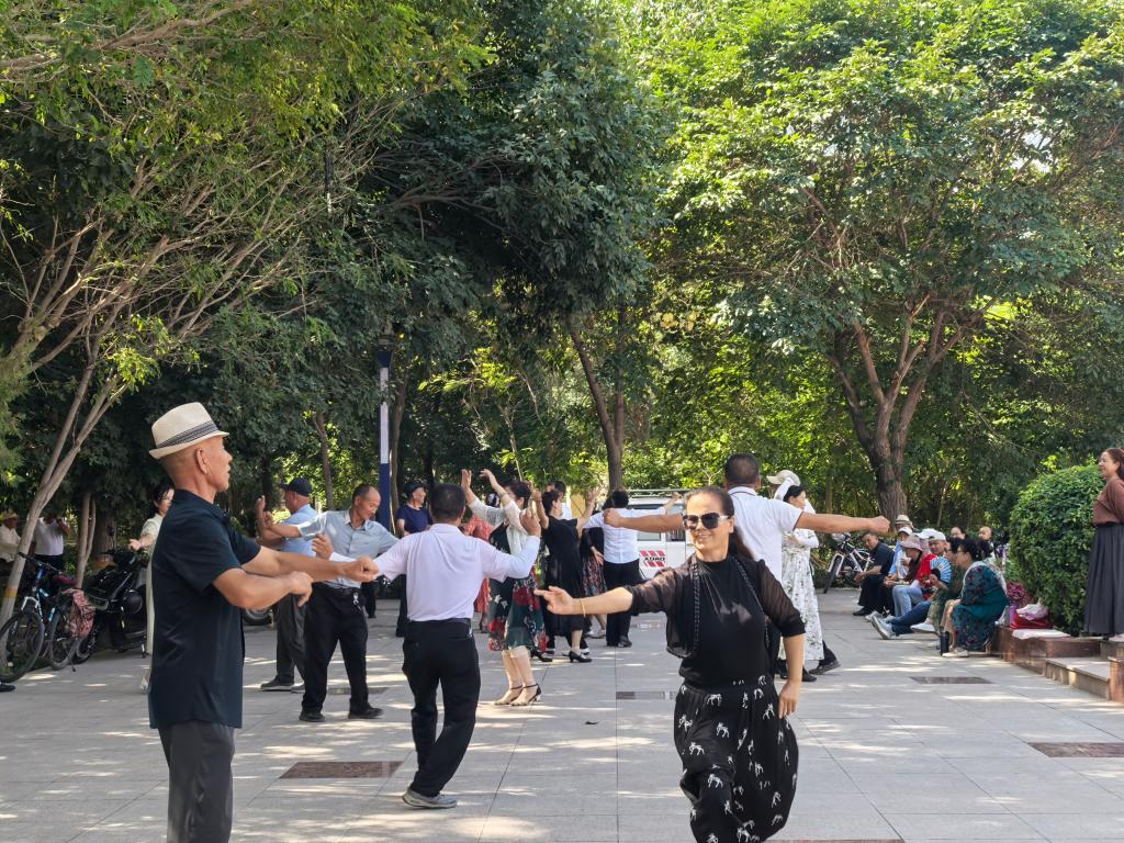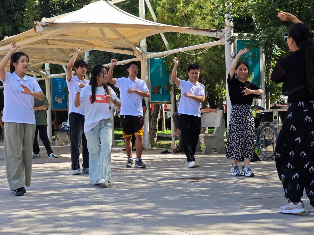 在充满现代化气息的文化广场上,实践队员们还发现了这样一支队伍,她们跳着活泼优美、步伐轻快灵巧的维吾尔族舞蹈,向大家最直观地展现出了新疆各族人民的热情与朝气,充满了浓厚的地域特色和生命力。实践队员们在石老师的带领下积极融入其中,学习了维吾尔族舞蹈的基本步伐、手位与节奏,在躬身实践中更好地感悟了民族文化魅力。