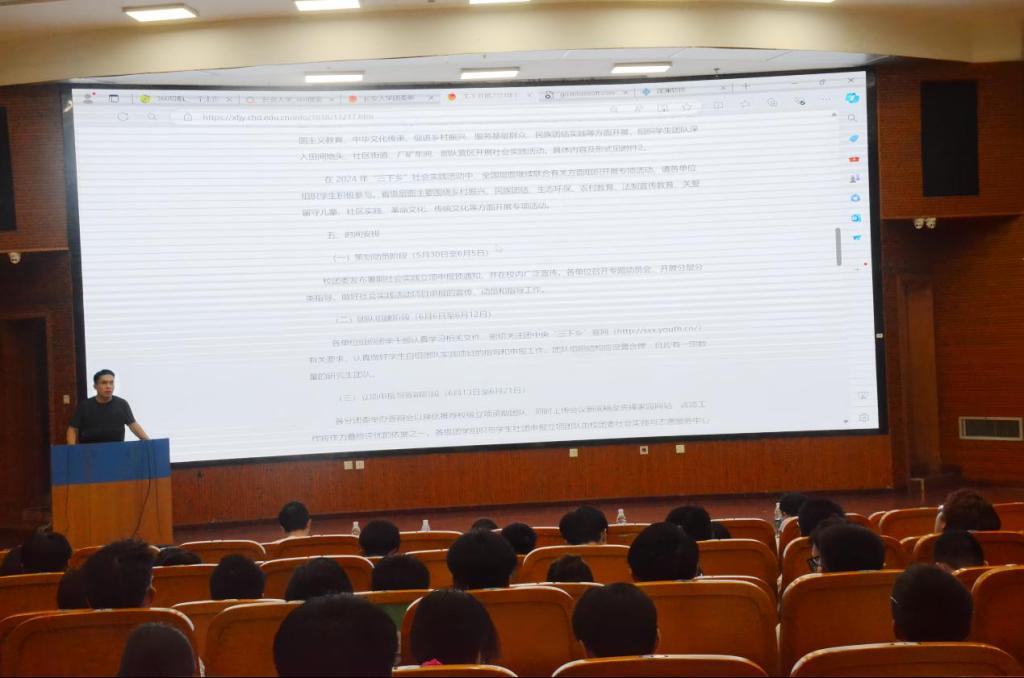 为深入学习宣传贯彻习近平新时代中国特色社会主义思想和党的二十大精神,切实发挥共青团作为广大青年在实践中学习中国特色社会主义和共产主义的学校作用,引导和帮助广大青年学生在与现实相结合的“大思政课”中“受教育、长才干、作贡献”,引领学生立志做有理想、敢担当、能吃苦、肯奋斗的新时代好青年,结合暑期社会实践要求为同学们提供更全面的信息及详尽的指导,地测学院团委于7月6日下午14:30在图书馆西侧就业报告厅开展2024年暑期社会实践动员宣讲会暨培训指导会。地测学院团委书记苗行生,2021级辅导员杨海城,2023级辅导员侯梦阳、史杨季出席了本次会议,2023级各班班长和团支书,各立项社会实践团队及社会实践个人参与了会议。会议由党晶同学主持。