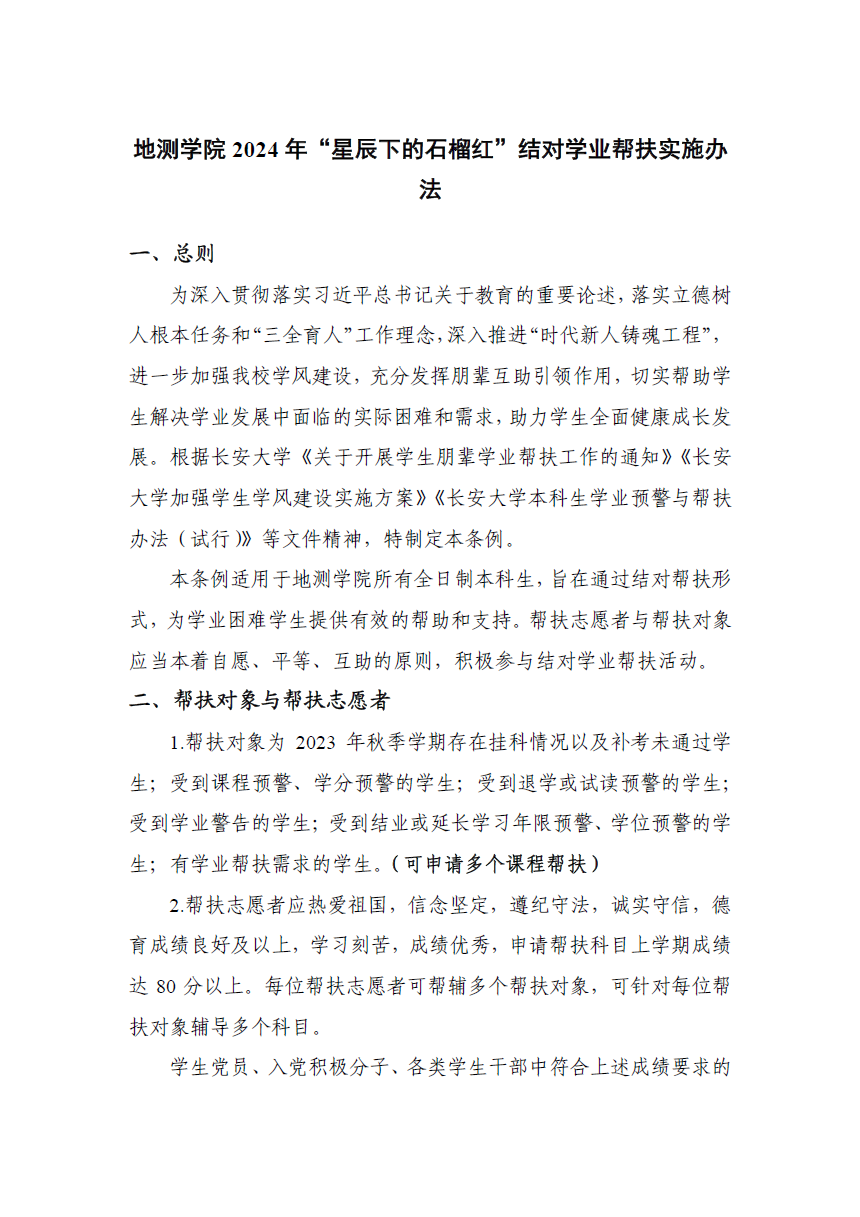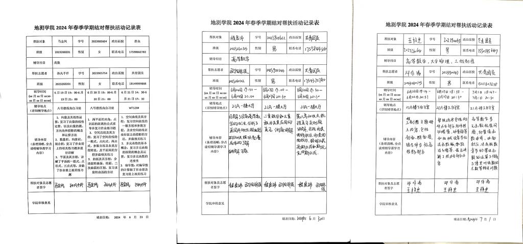 充分发挥学业优秀同学带动作用,学院制定《地测学院2024年“星辰下的石榴红”结对学业帮扶实施办法》。细致规定结对帮辅参与主体,畅通帮辅联络渠道,提高长期学业帮辅学生覆盖率,本学期参与人数达70余人;明确帮辅过程管理,明晰帮辅形式、学生辅导内容以及辅导活动记录要求,引导小组学业帮辅更加规范化;细化帮辅效果评估及优秀志愿者奖励办法,提升帮扶志愿者参与主动性;发挥“一站式”学生社区管理优势,引导学生积极利用宿舍和社区自习室学习空间,充分整合碎片化时间开展学业指导、问题答疑等活动,进一步增强学业帮辅实效。