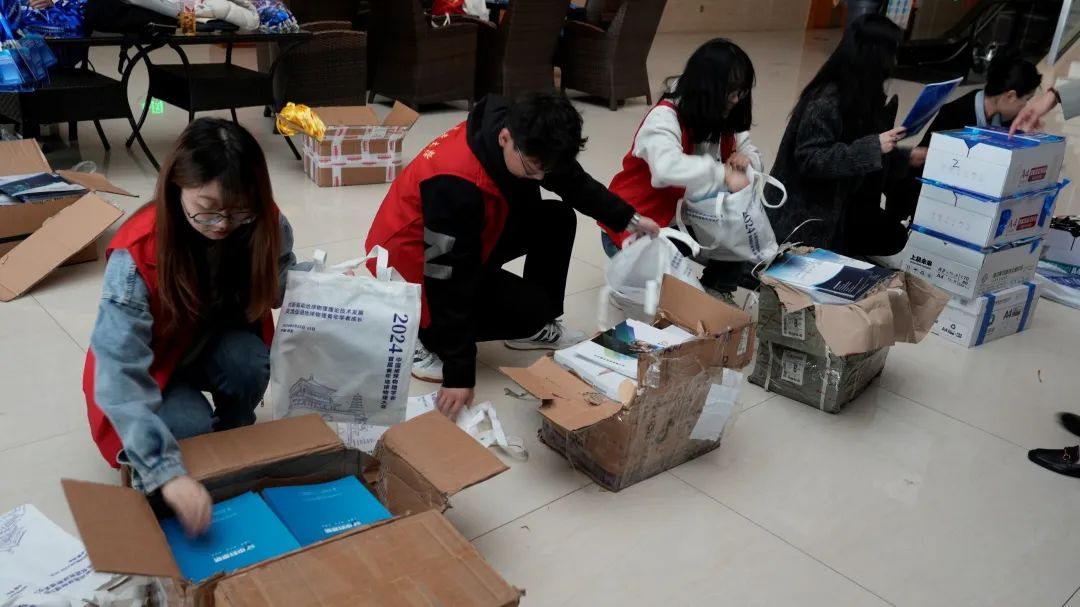 志愿者们正在有序进行注册签到及会议物资发放工作