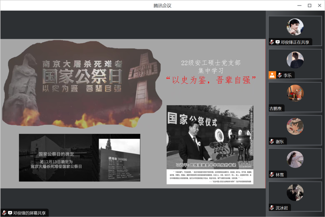 2023年12月13日是第十个南京大屠杀死难者国家公祭日。86年前的今天,侵华日军野蛮侵入南京,制造了惨绝人寰的南京大屠杀,30多万同胞惨遭杀戮,三分之一建筑被毁,大量财物遭到掠夺……对我们来说,这不仅是一段历史记忆,更是一次对和平的深刻思考和警醒。12月13日,地测学院2022级安工硕士党支部以“以史为鉴,吾辈自强---南京大屠杀死难者国家公祭日”为主题开展集中学习。