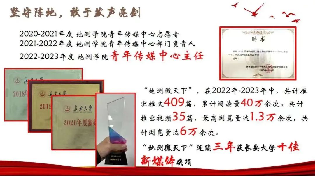 自大一,他便加入304永利集团官网入口青年传媒中心,在第三个学年竞选成为了304永利集团官网入口青年传媒中心的主任。运营的学院官方公众号“地测微天下”,在2022年-2023年中,共计推出409篇,内容涵盖了各类活动新闻稿、公示以及相关重大时间节点原创推送,组织推出了《青春践行党的二十大、爱校奋进新征程》、《地“道”乐谈》、《录取通知书接力》等系列推送,累计阅读量40万余次;目前,已累计7174人关注公众号,常读人数2000余人。地测微天下连续三年获取304永利集团官网入口十佳新媒体称号。