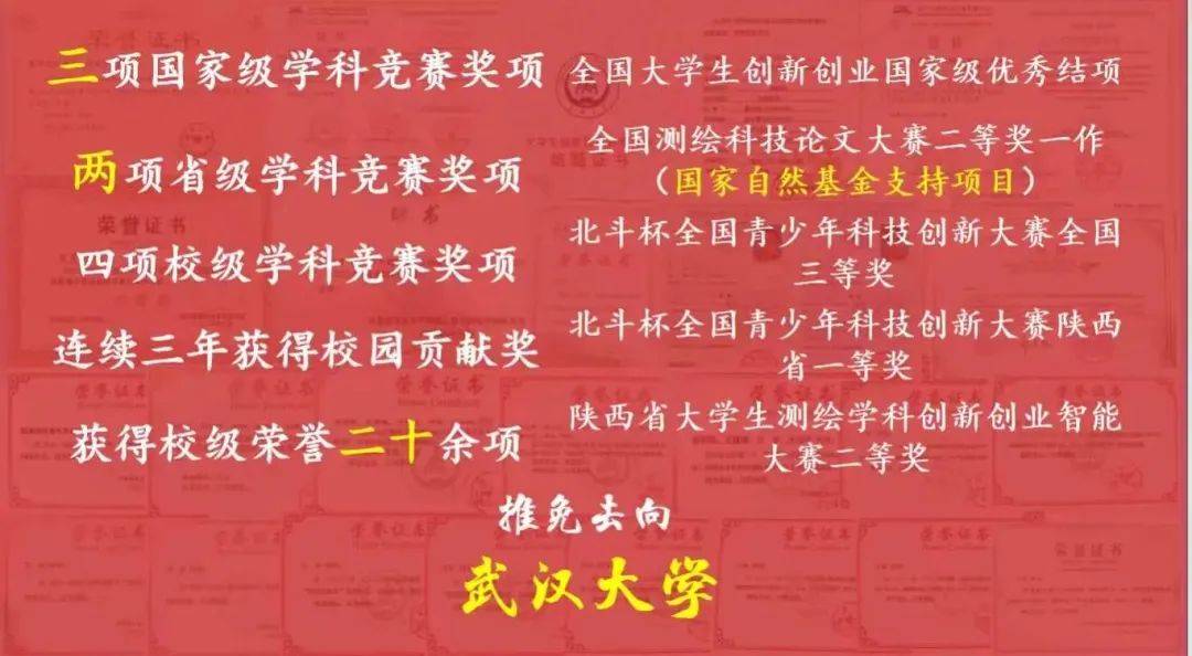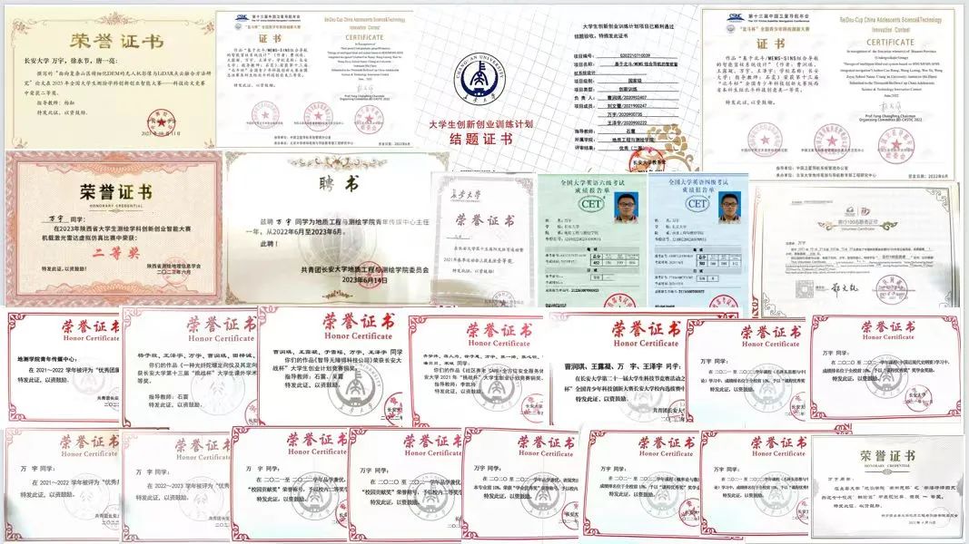 他也深知学习不止于书本,他也积极参与科研竞赛之中。大二学年,作为团队主要成员参与了北斗杯全国青少年科技创新大赛,并获得了校赛一等奖、陕西省一等奖、全国三等奖的好成绩。大三学年,作为第一作者参与测绘科技论文大赛,撰写论文《面向复杂山区精细化DEM的无人机影像与LiDAR点云融合方法研究》并获得全国二等奖。在大学生测绘学科创新创业智能大赛虚拟仿真激光雷达赛道荣获陕西省二等奖。同时,他也获得挑战杯校赛金奖一次、校赛铜奖两次、北斗杯校赛一等奖一次。他作为团队主要成员参与一项国家级大学生创新创业项目《基于北斗/MEMS组合导航的智能盲杖系统设计》,该项目现已顺利结题,并获得国家级优秀结项。
