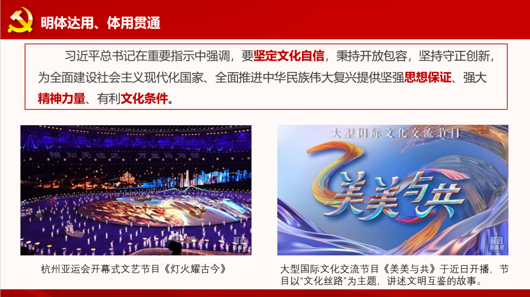 习近平总书记在重要指示中强调,要坚定文化自信,秉持开放包容,坚持守正创新,为全面建设社会主义现代化国家、全面推进中华民族伟大复兴提供坚强思想保证、强大精神力量、有利文化条件。