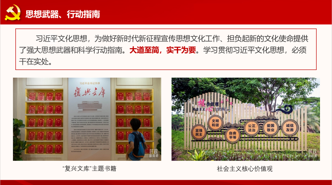 习近平总书记在新时代文化建设方面的新思想新观点新论断,内涵十分丰富、论述极为深刻,是新时代党领导文化建设实践经验的理论总结,丰富和发展了马克思主义文化理论。习近平文化思想为做好新时代新征程宣传思想文化工作、担负起新的文化使命提供了强大思想武器和科学行动指南。