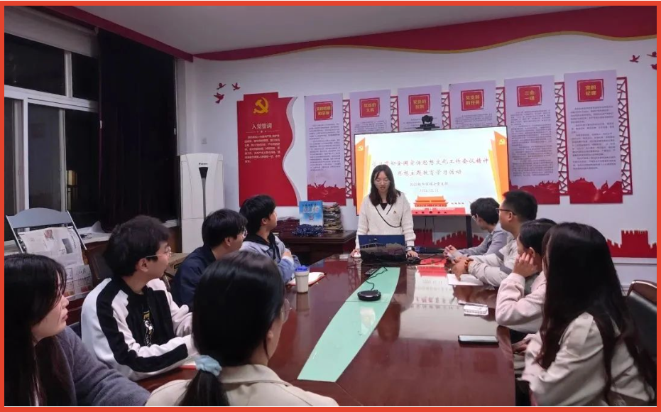 为深入学习贯彻全国宣传思想文化工作会议精神思想主题教育,加强党员对习近平新时代中国特色社会主义思想的认识。地测学院23级物探硕士党支部10月上旬在南校区东院第二教学楼107会议室开展了相关的学习活动。会议由支部书记周梅同志主持,全体党员参与。