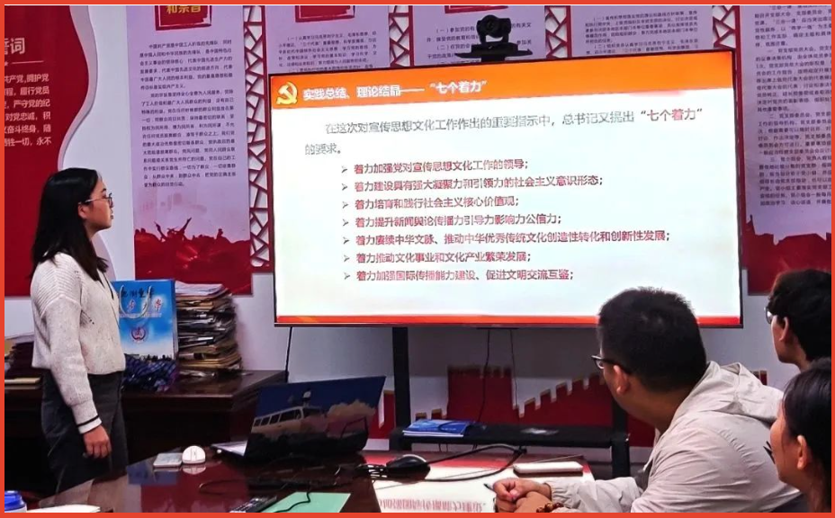 随后,支部书记周梅带领大家深入学习了全国宣传思想文化工作会议精神。支部成员认真学习了会议内容,深入理解了宣传思想文化工作的重要性。重点强调了在全国宣传思想文化工作会议首次提出的习近平文化思想以及习近平总书记提出的“七个着力”的要求。
