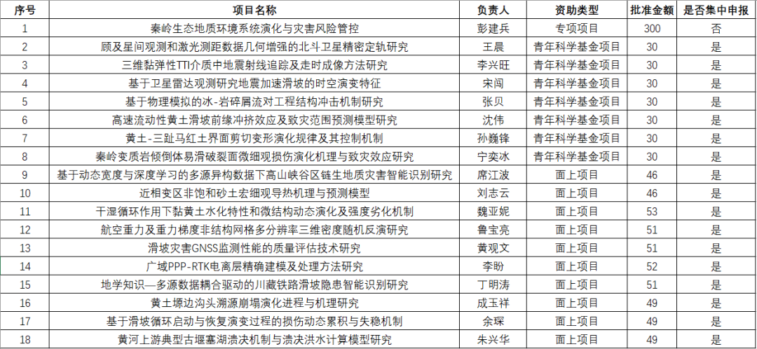 近日,国家自然科学基金委公布了2023年度国家自然科学基金项目评审结果。在学院教职工的共同努力下,永利集团官网2023年度国家自然科学基金项目共获批18项,彭建兵院士获批重点专项项目1项,集中获批面上项目10项,青年基金项目7项,资助项目经费总额1007万元。