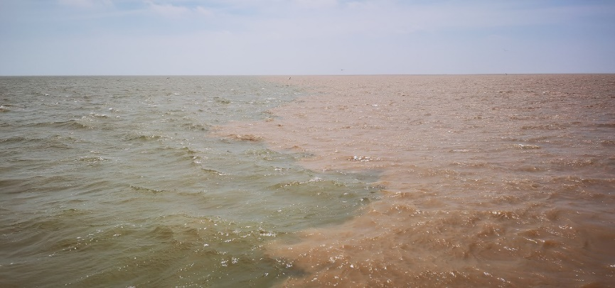 实践活动的第三站是黄河入海口。在山东东营,科考队员乘坐游艇抵达黄河入海处,看见“黄河入海流”中雄浑的黄河与蔚蓝的大海相遇,造就了“河海交汇”的旷世奇景。