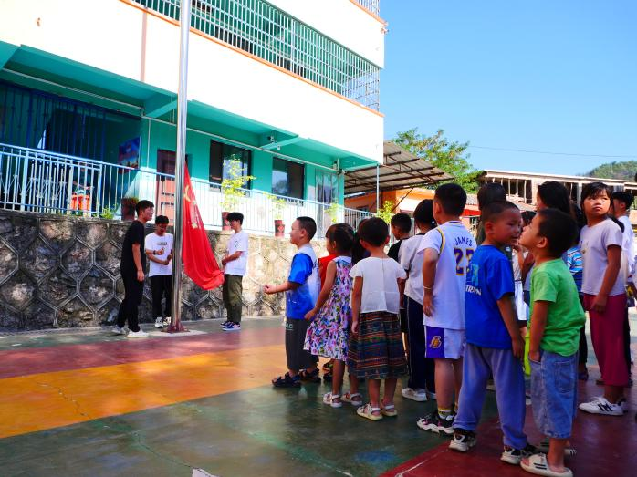为培养孩子们爱国主义精神,树立爱国意识,增强孩子们的民族自豪感,上午9点,304永利集团官网入口筑梦黔行队与30余位孩子们进行了庄严的升旗仪式。迎着支教课程开始的第一缕晨光,升旗仪式正式开始,旗杆旁,304永利集团官网入口筑梦黔行队队员护送着鲜艳的五星红旗,他们目光如炬,队列整齐,步履铿锵。在庄严的国歌声中,五星红旗冉冉升起。队列中,每一位孩子深怀对祖国无限的热爱和崇高的敬意行队礼、高声唱响国歌,伴随着雄壮嘹亮的国歌声,全体队员与孩子们正式开启暑期支教课程。