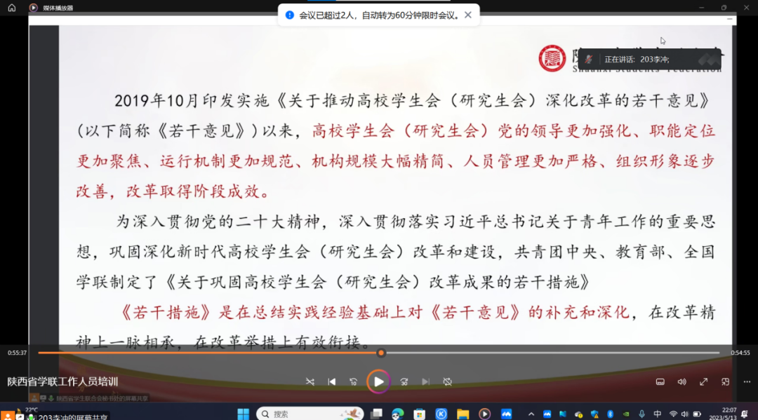 会议伊始,执行主席石钰结合当前学生会工作情况介绍了此次培训会的重要性和必要性。随后,带领同学们学习了2023 年春季学期陕西省学联学生会组织全体工作人员培训学习资料的相关内容并从以下三个方面进行培训:一、强调学生会组织要紧跟时代步伐,持续深化改革创新,积极落实相关要求;二、明确学生会基本任务,认识不足,继续强化学风建设,提升服务师生水平和意识;三、部署与展望未来学生会工作,要求同学们积极落实培训内容,把握时代主题,践行全心全意服务同学的宗旨。
