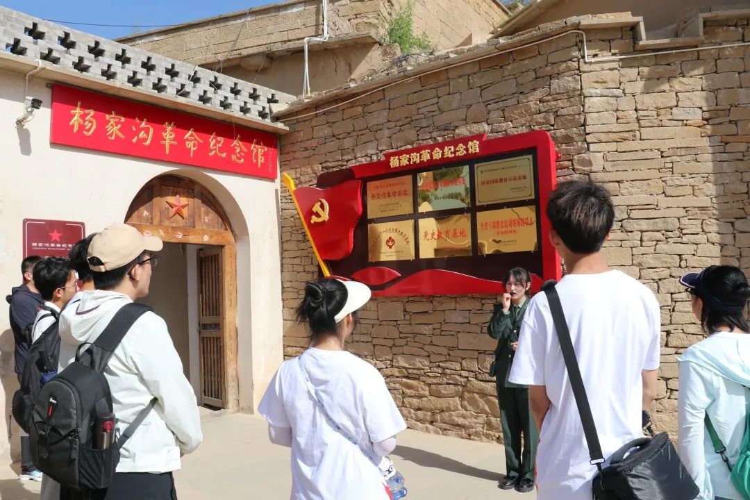 上午9时,实践队成员来到杨家沟革命旧址探寻米脂县红色精神的气息。在此,实践队员学习到了“十二月会议”的重要意义,了解了杨家沟在中共党史和中国革命史上的重要地位。在讲解员的引领下,实践队队员依次走过“十二月会议”旧址、主要参会人员住处及毛泽东主席等主要领导人的住址——新院,了解到十二月会议是在中国革命战争的历史转折关头召开的一次具有重大意义的会议。此次会议所制定的政治、经济纲领比《新民主主义论》和《论联合政府》中提出的纲领有了进一步的发展。更为难得的是,在毛泽东主席的塑像下,实践队成员遇到了五位来自延安的新中国第一代讲解员,在与他们的交流中,实践队成员们更加真切地感受到了老一辈革命人对祖国赤诚的爱,对红色文化有了更进一步的感悟。