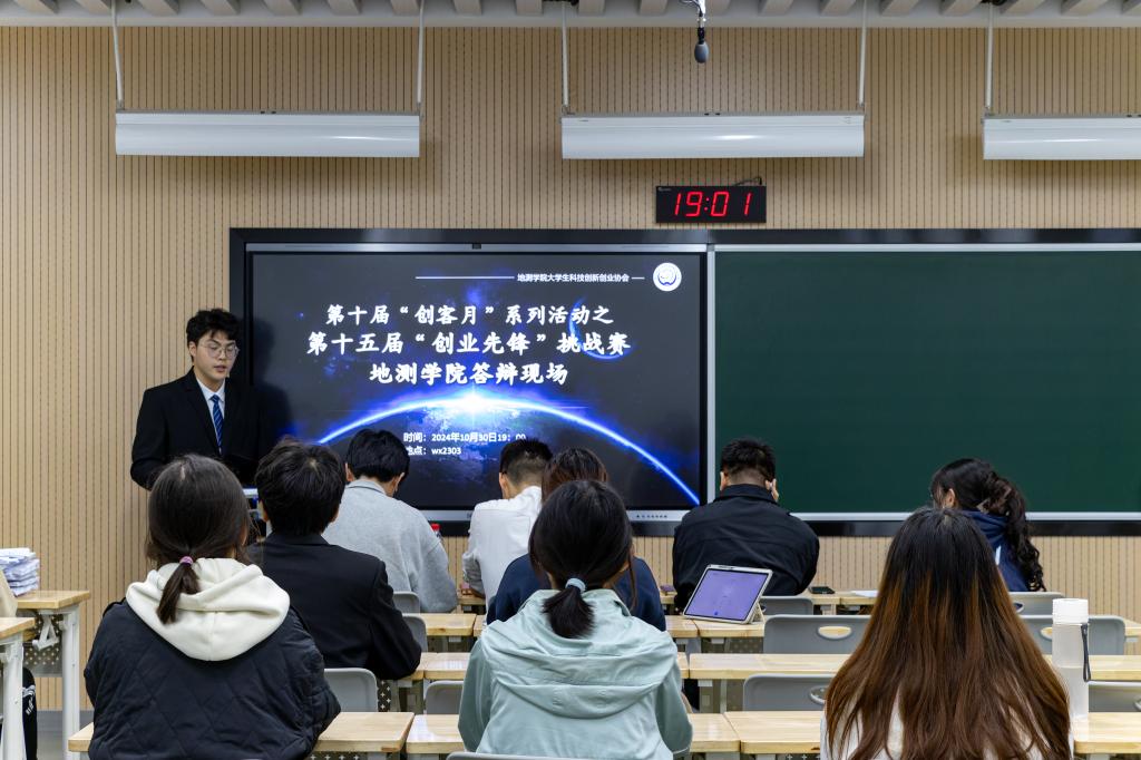 为提升学生创新能力,培养学生实践技能,给校园创新创业注入新活力,营造浓厚的学生创新创业氛围,304永利集团官网入口第十届“创客月”系列活动之第十五届“创业先锋”挑战赛地测学院初赛于2024年10月30日在WX2303教室顺利举行。本次院赛共18支队伍报名参赛,经过第一轮书面初步评审,共有13支队伍进入了答辩环节。本次比赛邀请了地测学院团委书记杨东民、2022级学生辅导员刘文星、2024级学生辅导员阚红淼以及地测科协2023-2024学年执行主席郭宝营担任评委,地测科协梅喆担任比赛主持。