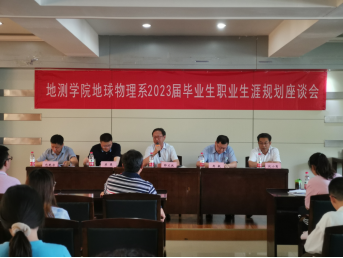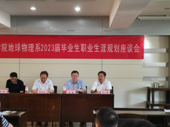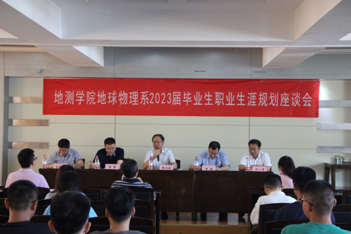 下午,李振洪院长、邵广周副院长、潘迎副书记和地球物理系实习指导教师等人邀请西安西北有色物化探总队有限公司党委书记、执行董事郭文波,中国石油西部钻探地质研究院西北分院党委书记郑毅,长庆油田勘探开发研究院副院长李斐和陕西省煤田物探测绘有限公司副总经理汶小岗针对考研与就业问题对学生进行指导座谈,座谈会由地球物理系主任包乾宗主持。