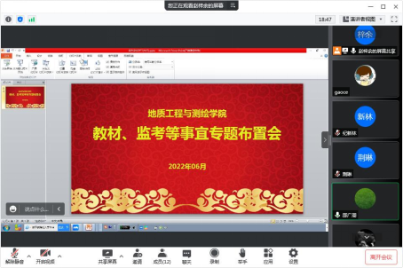 2022年6月21日15:00,永利集团官网以腾讯会议的方式召开2021-2022学年春季学期线上教学例会。地测学院党委书记戴宏、副书记副院长荆琳、副院长邵广周,各系党支部书记、教学副主任,学院专业建设及教学主管赵梓余、教务办高策老师参加会议。会议由副院长邵广周主持。