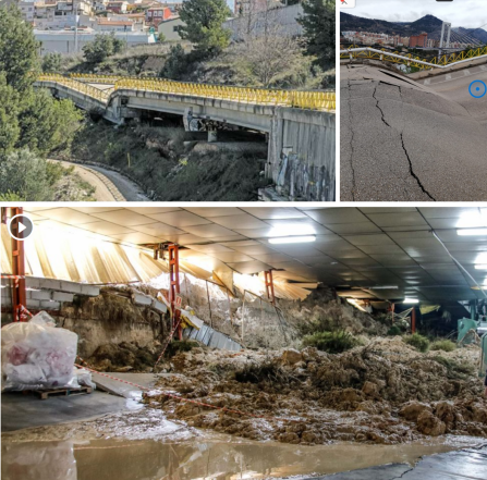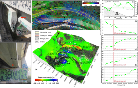 2022年4月初,西班牙东南部Alcoy市连续强降雨,诱发了该市圣地亚哥公园区大型滑坡出现多次局部滑动,摧毁一座桥梁、威胁多座居民楼和一个工厂的安全(如图2)。在该滑坡发生前的10个月,我校张勤教授研究团队与西班牙阿利坎特Roberto Tomás教授团队合作,利用合成孔径雷达干涉测量技术(InSAR),采用德国TerraSAR-X与西班牙PAZ雷达数据对西班牙Alcoy全市进行了地质灾害早期识别与动态监测,成功探测出41个地质灾害隐患点,结合现场调查划定了三个滑坡高风险区(图3),并对风险区采用InSAR技术进行了动态跟踪监测,最终成功捕获到异常形变现象(图4)。相关研究成果在滑坡发生前多次提交给Alcoy市政管理部门,有效指导该滑坡灾害的管理及防灾减灾工作,避免了人员伤亡与经济损失。