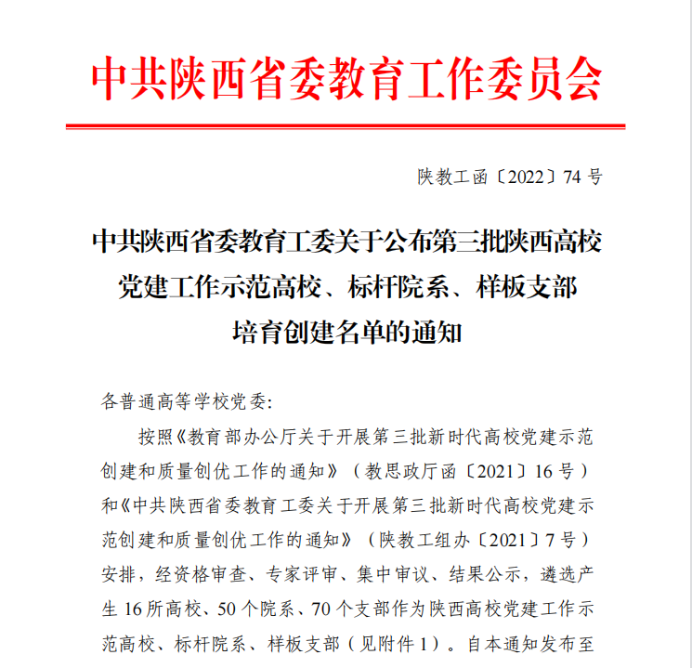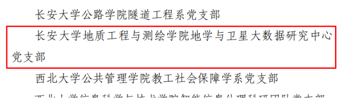 日前,中共陕西省委教育工委发布了《中共陕西省委教育工委关于公布第三批陕西高校党建工作示范高校、标杆院系、样板支部培育创建名单的通知》,我校304永利集团官网入口地学与卫星大数据研究中心党支部成功入选“全省党建工作样板支部培育创建单位”。