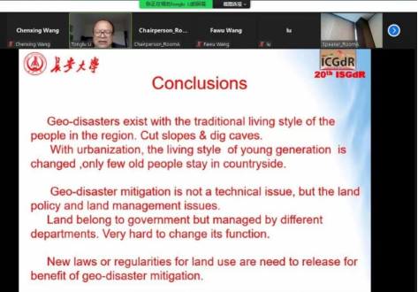 我站近20位师生通过线上参加了此次会议,在地质灾害的成灾机理、风险识别、实验模拟、计算分析、监测预报等方面开展了广泛且深入的交流。8月18日,李同录教授做了题为“Geo-disaster mitigation with urban development in the northern Chinese loess region”的特邀报告,博士生张子然、张斌、王晨兴、雷雨露、马学通、张林、李兆东、刘银鹏、赵枝艳与硕士生秦涛、张硕哲共11位研究生分别做了分组会议报告,报告主题鲜明、创新点突出,与参会代表进行了热烈讨论。
