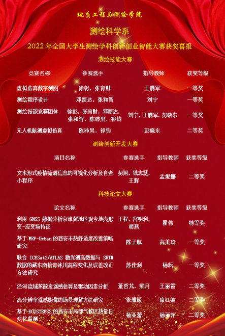 测绘科学在新技术革命的浪潮中迎来了前所未有的机遇和挑战,测绘高等教育也面临着新思维、新使命、新挑战。永利集团官网测绘科学系师生通过参与各类竞赛,促进了学生知识、能力、素质的协调发展,践行了以学生为中心、因材施教、个性培养的育人理念,达到了以赛促学、以赛促教、以赛促改的目的。