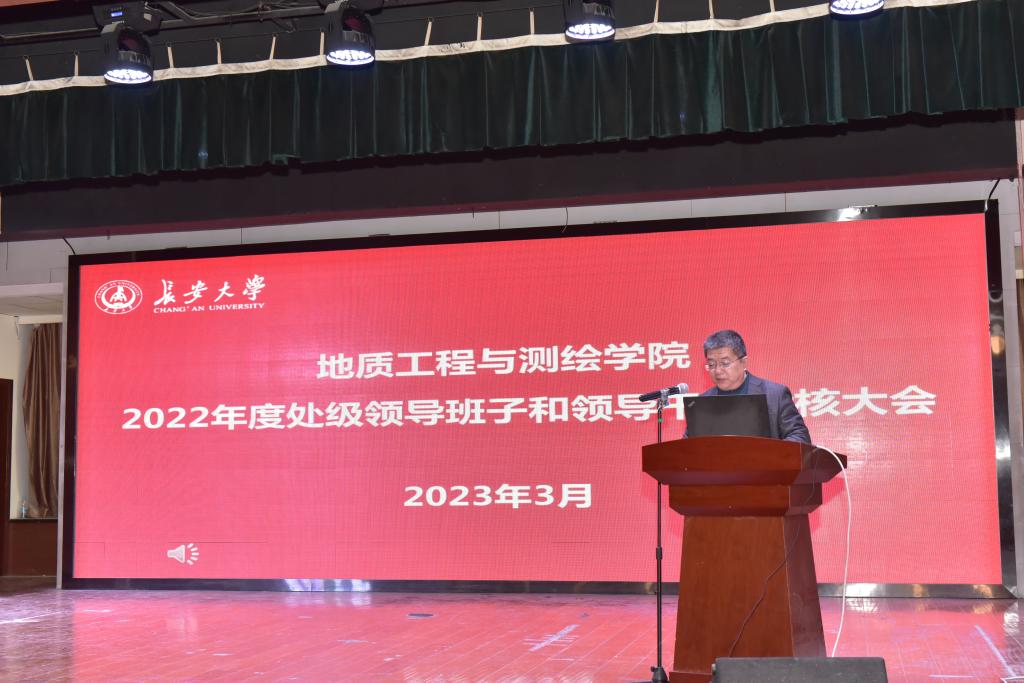 3月29日晚上,地测学院在南校区东院雁博园4楼研究生文化艺术中心大礼堂召开2022年度处级领导班子和领导干部年度考核大会。全体院领导班子与全院教职工参会,会议由院党委书记戴宏主持。
