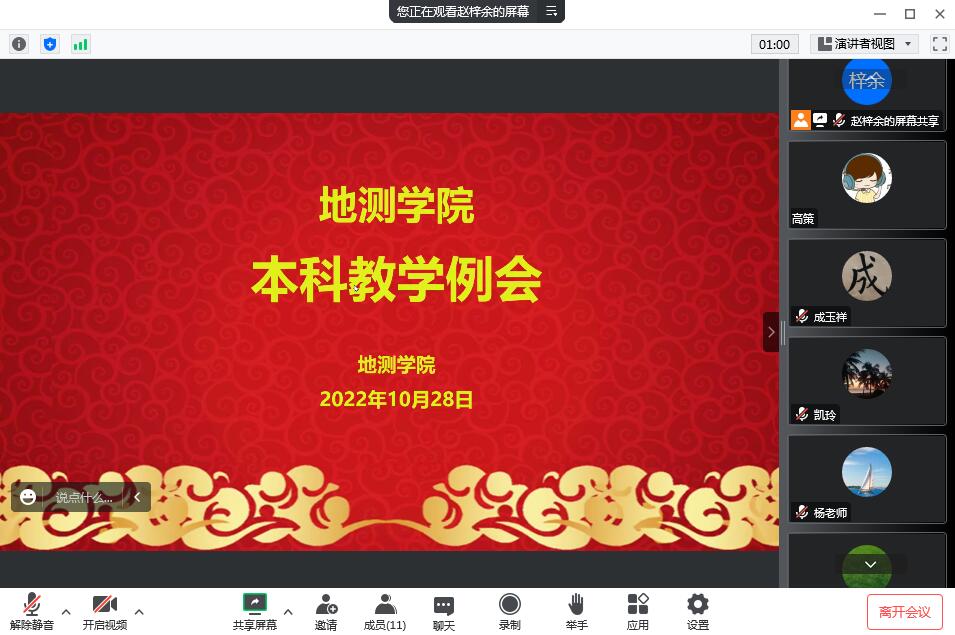 2022年10月28日晚,永利集团官网以腾讯会议的方式召开2022-2023学年秋季学期线上教学例会。地测学院副院长邵广周,各系教学副主任、实习副主任,学院专业建设及教学秘书赵梓余、教务办高策老师参加会议。会议由教学秘书赵梓余主持。