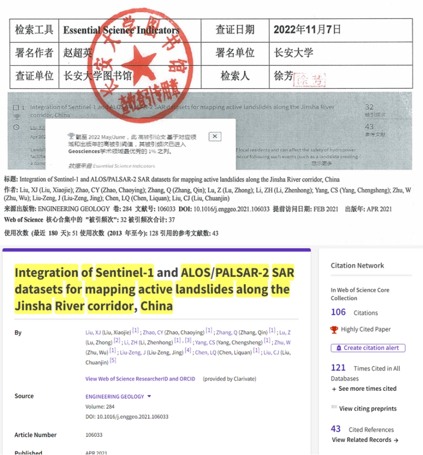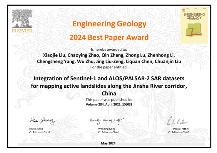 2024510日,地学领域权威学术期刊《Engineering Geology》揭晓了2024年度最佳学术论文奖。我校赵超英教授团队的研究成果《Integration of Sentinel-1 and ALOS/PALSAR-2 SAR datasets for mapping active landslides along the Jinsha River corridor, China》榜上有名。该奖项是从2021年至2023年间发表的所有论文中评选而出,经过论文总被引次数初选,主编和编辑团队审议而产生,最终仅有六篇论文入选