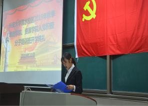 随后培训班班主任段少帅宣读《入党积极分子培训班课程安排》,班主任谢楠宣布《入党积极分子考核规定》。在学员代表任旭晨同学发言之后,资源学院党委副书记荆琳讲话。她表示入党积极分子应从思想上真正入党,在今后的学习生活中时刻规范自己的行为。讲话的最后,荆琳副书记表示,希望同学们通过本次培训能进一步学习党的知识,进一步端正入党动机,明确入党目的,经受党组织的考验。